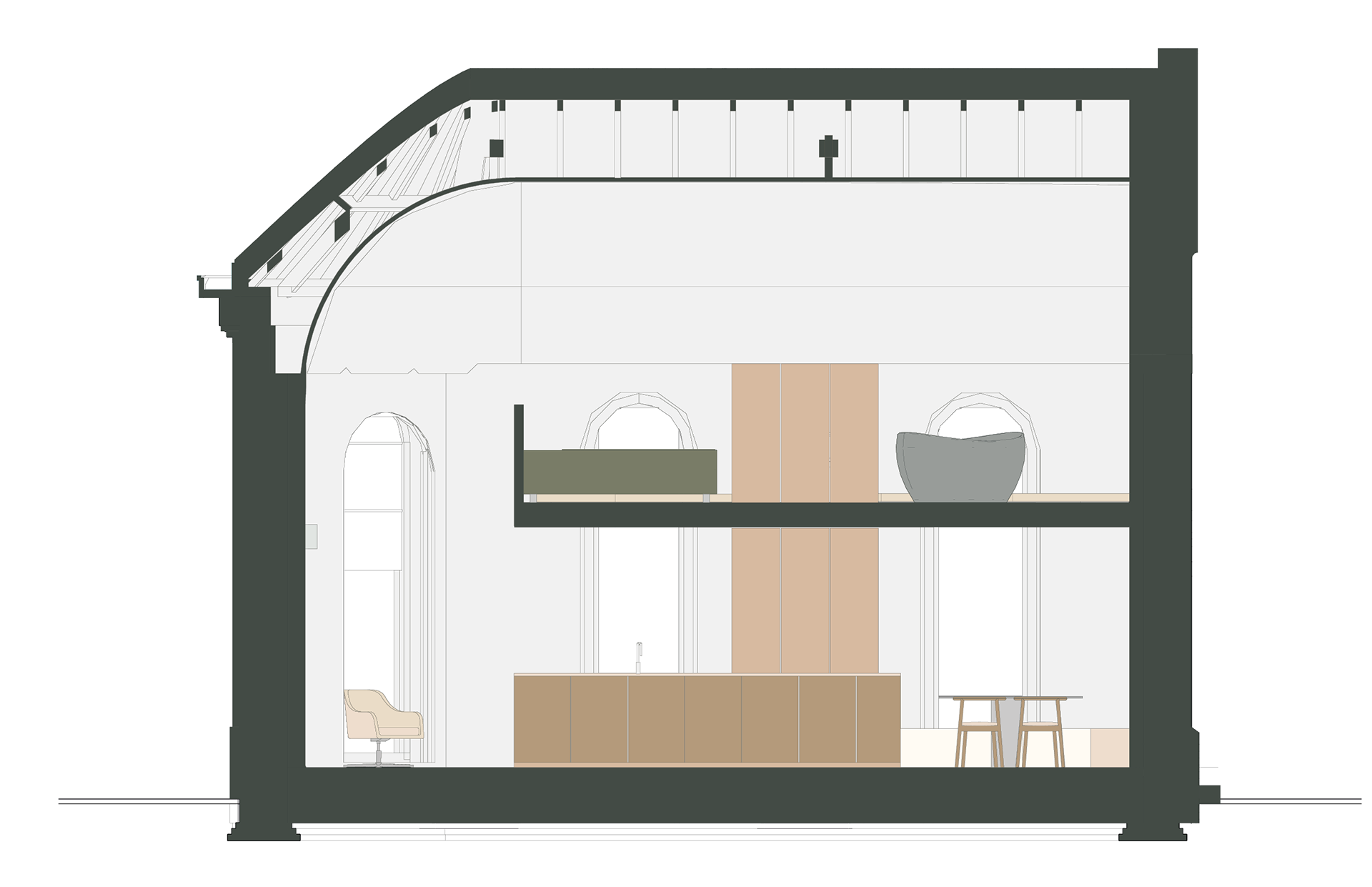 _Bouw een kapel om tot een rustgevende woning door het karakter en het volume te respecteren. Vertaal dit naar een woning die past bij een jong, sportief koppel.
