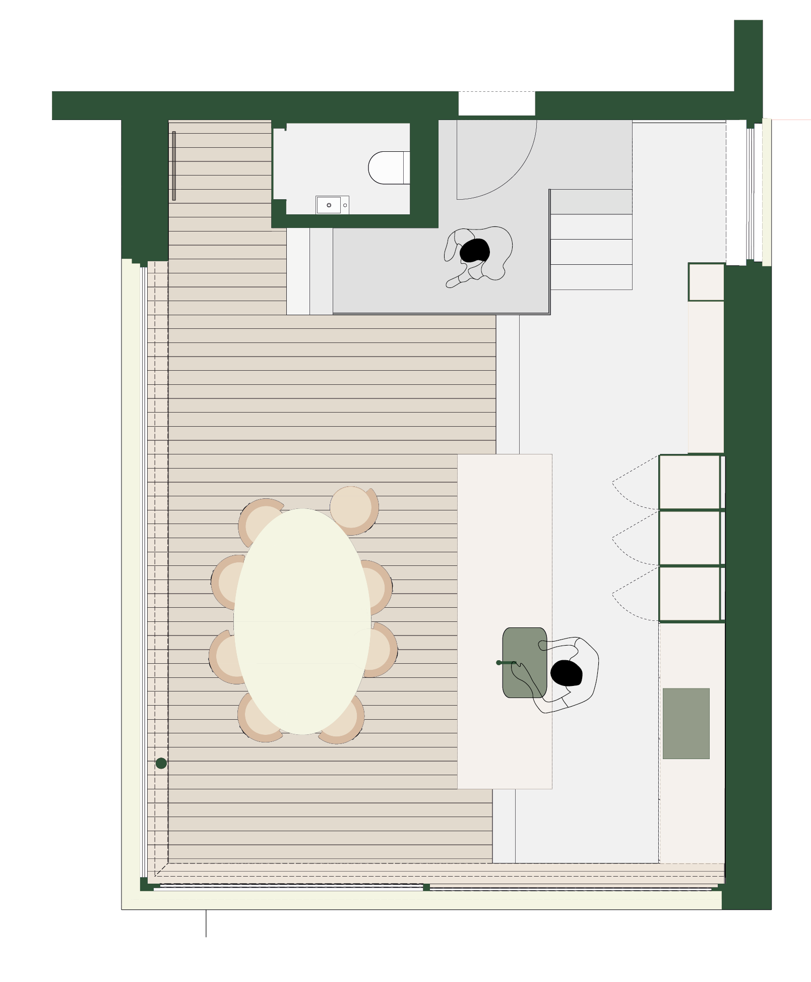 _Ontwerp een bijgebouw als keuken en eetruimte voor een ambitieuze hobbykok, waar koken het hart van de ruimte vormt en gedeeld wordt met gasten. Werk een efficiënte, industriële inrichting uit waarin kookzone en acht eetplaatsen in directe relatie staan, inclusief raamindeling, toegang en technische opbouw.