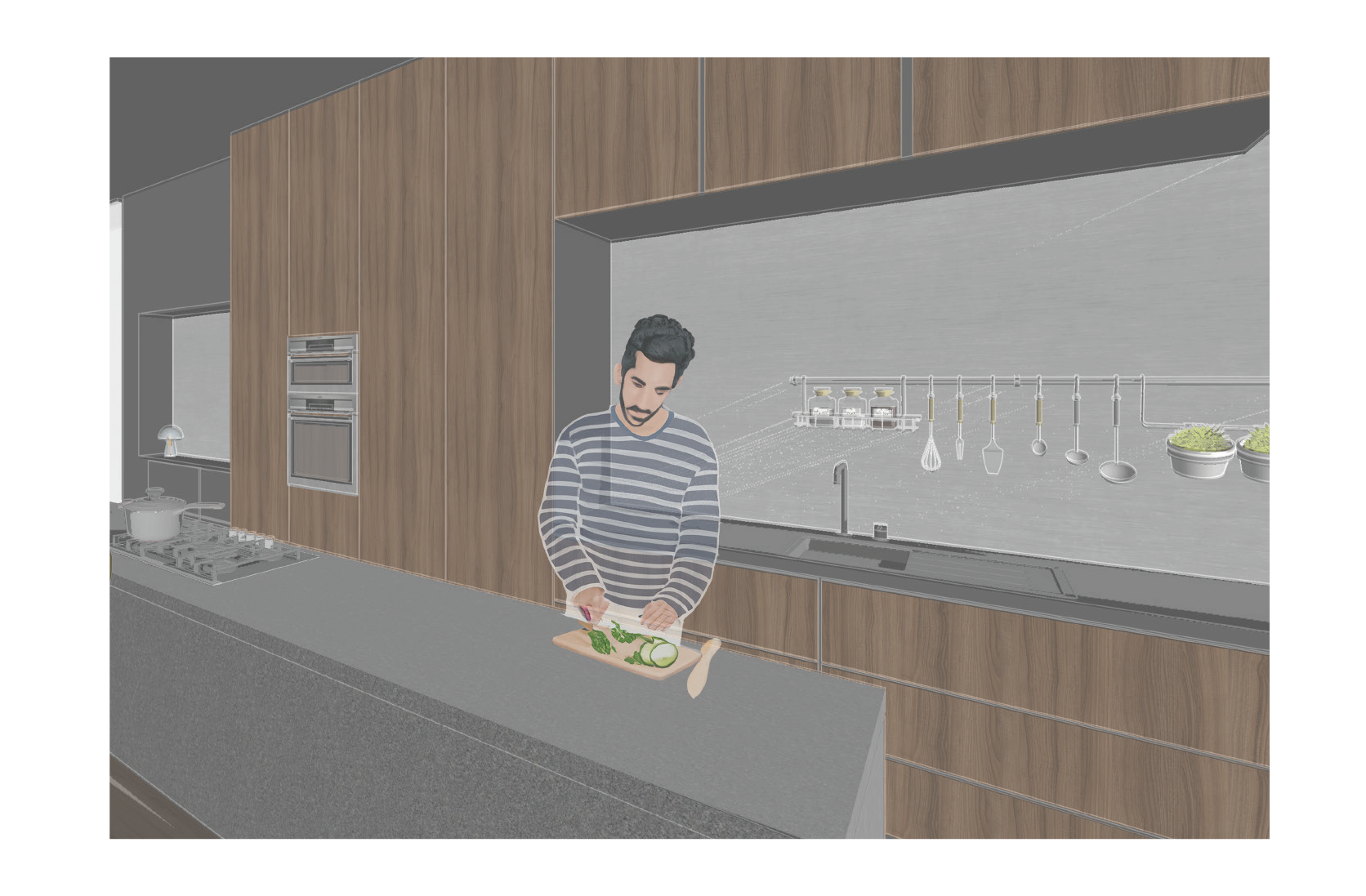 _Het concept vertrekt vanuit een verhoogde binnenkomst, waarbij de gast een overzicht krijgt over de volledige ruimte en de keuken als centraal werkplatform. De hobbykok kookt op een lager niveau waardoor het kookproces zichtbaar en leesbaar wordt.